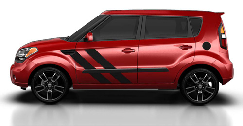 The Kia Hamstar Soul is based on the Soul+ trim level and stands out in Molten Red with a black star graphic with the "signature Hamstar script logo" on the hood and diagonal serrated stripes in matte black on the sides. First seen at the 2010 SEMA show, the Hamstar Soul also comes adorned with body-colored bumpers with a rear bumper applique, fog lights and a rear spoiler, black 18-inch alloy wheels, black fender vents with turn signals and a matte black alloy fuel door. A sunroof is also standard on all Kia Soul Hamstars.