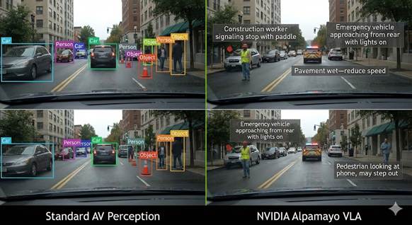 Alpamayo changes this by utilizing a VLA architecture. Similar to how Large Language Models (LLMs) understand the relationship between words, Alpamayo understands the relationship between visual elements and physical actions. It doesn't just see a "box"; it sees a "child chasing a ball into the street" or a "police officer gesturing for traffic to merge left." This ability to reason allows the vehicle to handle "edge cases"—those rare, complex scenarios that have historically led to autonomous vehicle recalls and safety stand-downs.