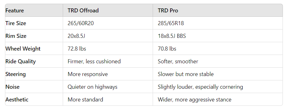 However, if you prefer a more responsive feel on the road with slightly less road noise, the TRD Offroad wheels might suit you better. The larger rims and narrower tires provide a firmer ride that gives more feedback from the road, which some drivers prefer, especially in city or highway driving.