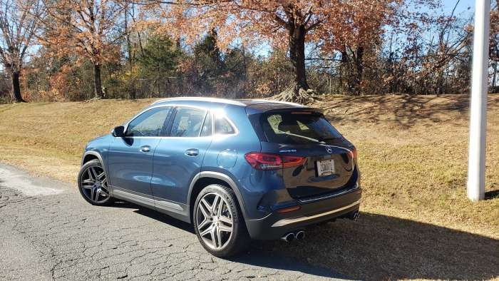 The rear of the 2020 Mercedes-AMG GLA 45 S 4MATIC + features a double tailpipe with 90-millimeter diameter oval tails. There is also a widening rear apron, an air diffuser and a large spoiler.
