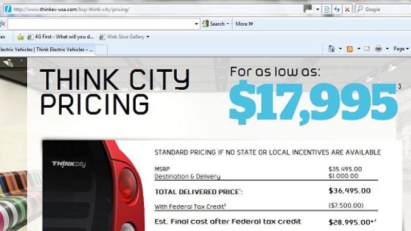 Torquenews wouldn't pay much attention to this pricing combination if not Chelsea Sexton's this tweet. "Wow, @Think_EV -worst example of misleading EV pricing I've seen. Lot buried in fine print. http://bit.ly/j745jU."