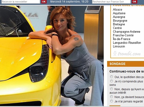 Innovation is also at Frankfurt during September 15 to 25 of 2011. It's cars, innovation, on-board computers connecting to entertainment and phones as well as beautiful models hosting the stands. France Soir has prepared an interesting slideshow titled the Hostesses of Frankfurt Auto Show. The accompanying image is just a little screenshot from the website, showing an Italian hostess next to Ferrari Spider.