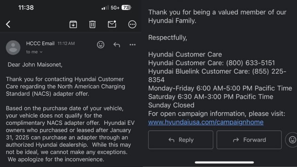 Turns out, John did some digging, and even received a direct email from Hyundai. Their reply confirmed the cutoff date: “Based on the purchase date of your vehicle, your vehicle does not qualify for the complimentary NACS adapter offer. Hyundai EV owners who purchased or leased after January 31, 2025 can purchase an adapter through an authorized Hyundai dealership.” In other words, that “free Tesla adapter” perk had an expiration date, and John’s lease fell just outside of it.