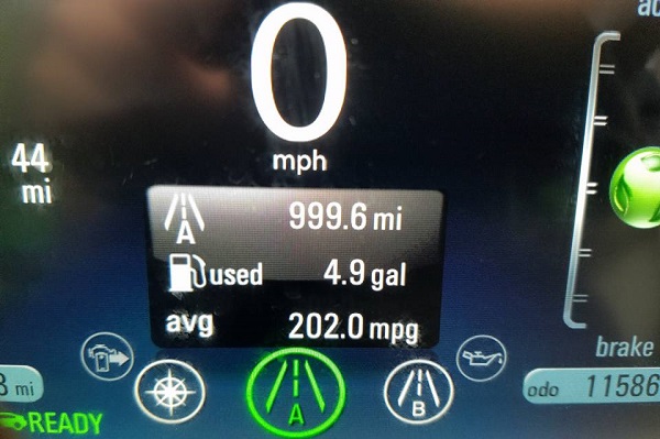 A man, named Steve Prinsen, just posted his Chevy Volt's fuel economy achievement in Chevy Volt Owners public group on Facebook displaying Volt MPG on give gallons of gas. He drove 999.6 miles, using 4.9 gallons of gas. His effective MPG is 202 miles.