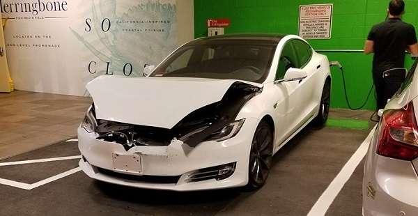 "The car appeared new when I arrived at the Aria 4:45pm Sunday evening. It had a license plate on the front that said Zero Emissions. The chargers were full, so I parked my Leaf in a normal spot," writes Matthew Royer from Las Vegas, sharing this image of this crashed Tesla in LEAF Owners public group on Facebook.