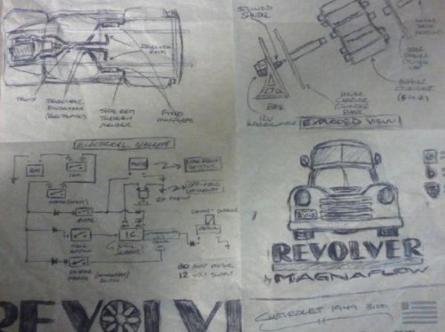 The idea for the 1949 Chevrolet Revolver pickup began as a simple napkin drawing sketched out (and shown on the right) by MagnaFlow Senior Manager Richard Waitas while he was waiting for a flight. His idea for this truck was that it could help answer the age old exhaust question of “What does it sound like?” The result is an antique pickup truck with a system of mufflers on a rotating assembly similar to that found on a revolver pistol. These 8 mufflers can be rotated to show what the different muffler options sound like when absolutely nothing is changed except for the muffler itself.