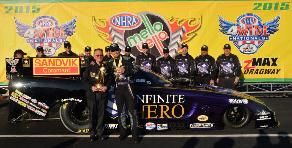 The 2015 Dodge Charger funny car has been a beast throughout the first three events of the 2015 NHRA racing season, with Matt Hagan winning two and Ron Capps winning one thus far. The fourth event of the season would pose an interesting challenge, as the teams descended on ZMax Speedway in Charlotte, North Carolina for the unique Four Wide Nationals. Unlike normal races that have cars racing two at a time, ZMax has four side-by-side lanes, allowing the cars to make each round in groups of four. In each race of the first two rounds, two drivers win and two drivers lose while in the final race, all that matters is being across the line first.