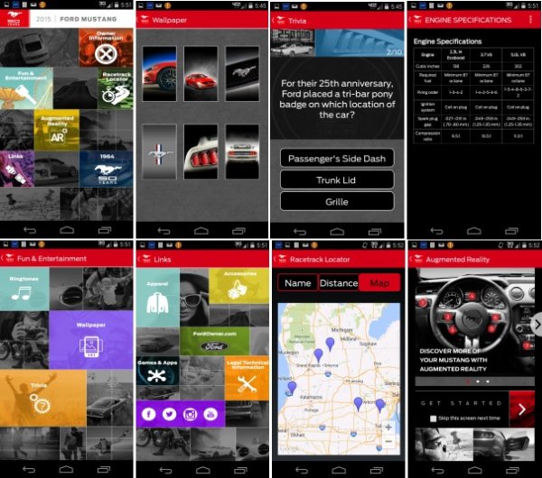 This section of the 2015 Ford Mustang app has things like Mustang ringtones (6 of them), Mustang wallpaper images (again, 6 of them) and Mustang trivia.