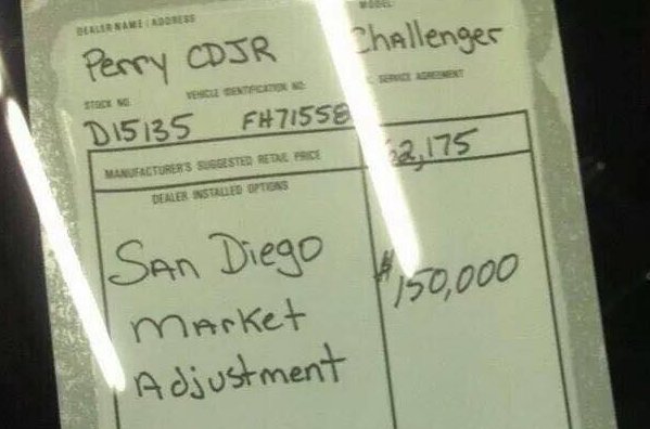 According to a variety of sources including Motor Authority, Perry Dodge received their silver 2015 Dodge Challenger SRT Hellcat, but they weren’t sure what they were going to ask for the 707hp muscle car. Because of this, they didn’t want the car on the showroom floor, so it was moved to a back lot and an employee was told to not a “Not for Sale” sign on the car. Instead, that employee thought that he or she would be funny and deter interested buyers by putting a dealership option sticker in the window with a $150,000 markup for a San Diego Market Adjustment.