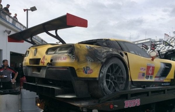 Shortly before noon today, the image above showing the #4 Chevrolet Corvette C7.R all burned up on a rollback wrecker was posted to Twitter by user @GearboxGirl with the title “Smells crispy”. No other information was offered, but this is one of those pictures that is worth a thousand words, as there is no question that the #4 Corvette was fairly seriously burned.