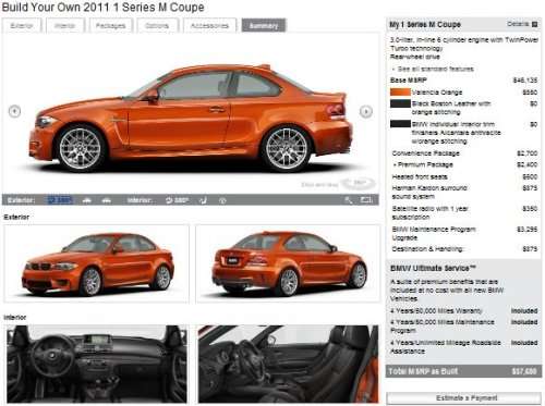 The final step in the 2011 BMW 1 Series M Coupe configurator is the accessories page, giving you the option of the Maintenance Program Upgrade for $3,295 which brings your BMW service plan coverage up to 6 years/100,000 miles and the BMW Assist Convenience Plan for $199, which offers a sort of concierge service, offering you directions and traffic/weather information. I would definitely opt for the extended service program (BMW’s service program covers brake pads, brakes rotors and drive belts in addition to oil changes and other routine maintenance), and when I added in the extra $3,295, it brought my dream BMW 1 Series M Coupe to a grand total of $57,680 - $1,220 cheaper than the 2011 BMW M3 Coupe.