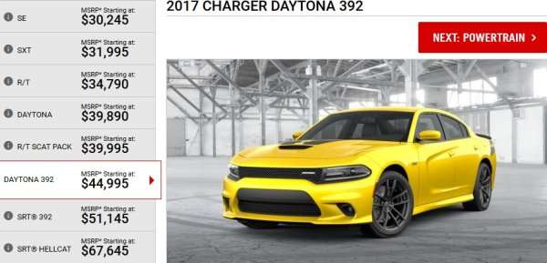 Next we have the new Daytona 392 package, which is built on the R/T Scat Pack. The Daytona 392 package adds the 2.75 inch active exhaust, package-specific exterior badging, sport suspension, the huge Brembo brake package from the Hellcat Charger, unique 20 inch wheels wrapped in the Hellcat Pirelli tires and a 180mph speedometer. The 2017 Charger Daytona 392 starts at $46,090.