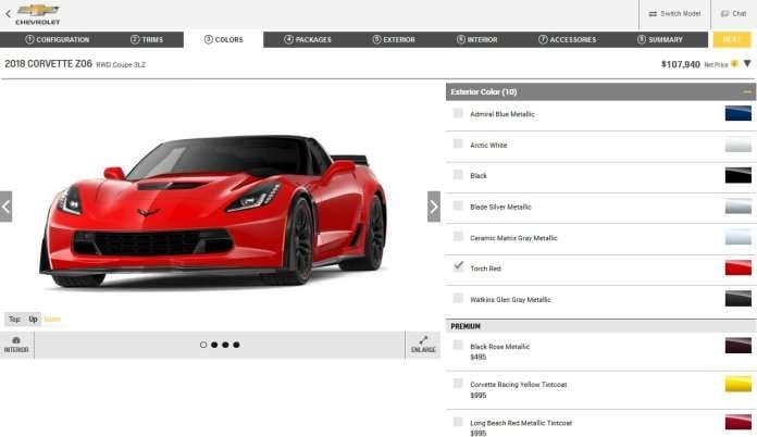 After you have selected the packages for your 2018 Corvette Z06, you can pick from 8 different wheel options including the $1,595 setup shown above with black wheels and red painted stripes. Also on the exterior option page, you can add the 8-speed automatic transmission for $1,725 along with a long list of different colors brake calipers, different removable roof panels (coupe only), a variety of car covers and unique wheel center caps.