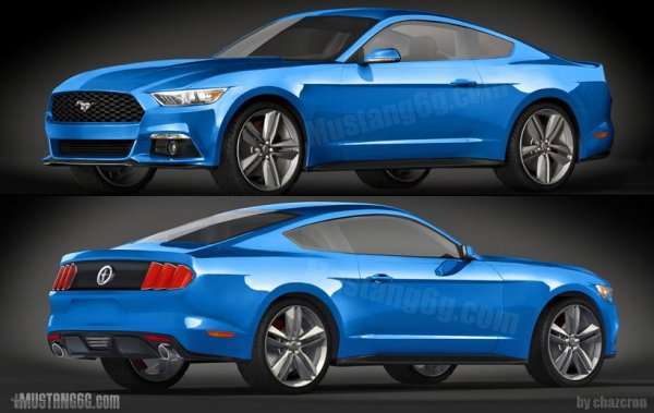 As has been the case with most of the high quality renderings we have seen of the 2015 Ford Mustang, this newest bit of automotive artwork comes from the folks at Mustang6g.com. This latest rendering is executed beautifully by chazcron; the same skilled artisan who has provided us with previous renderings that have gotten our engines running but this time chazcron has offered up the next generation Mustang from the front and rear and in two different colors – blue and red. Ive consolidated two of his images into one for easier viewing but you can click here for a look at the red 2015 Mustang at Mustang6g.com.