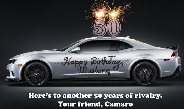 Finally, for those keeping track, the Chevrolet Camaro is currently in its 40th year of production, having been introduced 47 years ago and taken 7 years off from 2003-2009. The company celebrated the Camaro's 35th birthday with a special red convertible package and with five model years since being reintroduced (2010, 2011, 2012, 2013, 2014), it will be interesting to see if GM rolls out some special package to celebrate the 40th model year of the mighty Camaro. In any case, it is a classy move by Chevrolet and GM to wish the Mustang a happy 50th...although this friendly attitude wont stop GM from trying to steal some New York thunder from Ford with the new 2015 Corvette Z06 Convertible.
