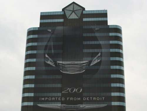 As you can see in the picture on the left, the 2011 Chrysler 200 pictured covering the west-facing side of the company’s 15-floor headquarters building is larger than life and as the “new” 200 looks to erase the demons of the outgoing Chrysler Sebring, Chrysler has used big marketing to show off the redesigned car. Along with the huge image on the outside of the headquarters, Chrysler put together the longest television commercial in Super Bowl history with the help of hip-hop superstar and Detroit native Eminem to show off the new 200 and to introduce the new company tagline – Imported From Detroit – which is also displayed on the outside of the Chrysler HQ building.