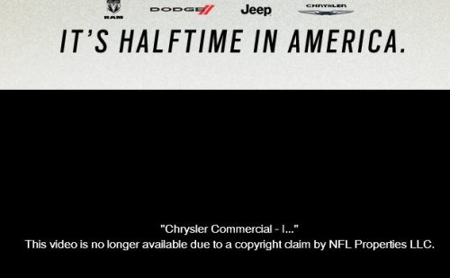 One of the keys to the success of any Super Bowl ad is the popularity and interest that it generates after the game and last year, Chrysler’s ad featuring rapper Eminem was quick to spread around the social networks with YouTube offering a wide variety of sources showing the commercial. However, it looks as though the NFL is working hard to make sure that doesn’t happen with this year’s Chrysler Super Bowl ad. Since the advertisement aired last night during while preparations were being made for the big halftime show, NFL legal crews have been running around the internet – forcing sources like YouTube to remove the commercial from their websites. In fact, as this article is being published even the official Chrysler channel on YouTube, which features the title of this new commercial in bold print across the top of the page (image shown on the right), does not actually have the commercial for viewing. When you click the play button you receive the message “This video is no longer available due to a copyright claim by NFL Properties LLC.” This might just be an error of some sort but right now, it looks like the kind of thing that could create a bit of a fuss between the NFL and the Chrysler Group as the National Football League’s legal staff is preventing Chrysler from showing off their high priced Super Bowl ad on the world’s largest video site. If nothing else, it sure doesn’t look like the NFL cares much about working smoothly with those companies who spend millions of dollars to advertise during the Super Bowl. The main issue is that right now, the NFL is preventing this new advertisement from obtaining the massive internet following that makes these ads so successful. Super Bowl ads have really become more about “going viral” the day after the big game than they are about attracting attention during the game and as things stand right now – the NFL is working to make sure that doesn’t happen.