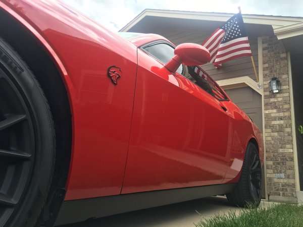 The Dodge Challenger SRT Hellcat shown here is owned by Ethan LaBerge, who just so happens to have the American Brother Designs Hellcat head logos on his muscle car. His Hellcat badges are painted TorRed to match his machine, and as you can see in all of these images – the badges are a perfect match. More importantly, the finish of the painted surface is smooth and consistent, looking quite different from the computer generated images on the website.