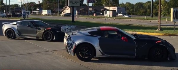 A YouTube account with the name David Wesel posted a video yesterday showing a large group of high performance cars pulling out of an Ohio gas station and the most notable cars among this group were a pair of camouflaged Corvette test cars which are almost certainly the next ZR1 – or whatever Chevrolet opts to name the package above the current Z06. This video shows a handful of what we believe to be Corvette ZR1 test cars along with a few current Corvette Z06 models, a Jaguar F Type and a Dodge Challenger SRT Hellcat.