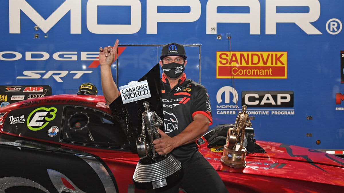 With 1,020 points, Matt Hagan and his Dodge Charger SRT Hellcat won the 2020 NHRA Funny Car Championship. Tommy Johnson Jr. was second with 915 points, Jack Beckman was third with 848 points and Ron Capps was fourth with 828 points.