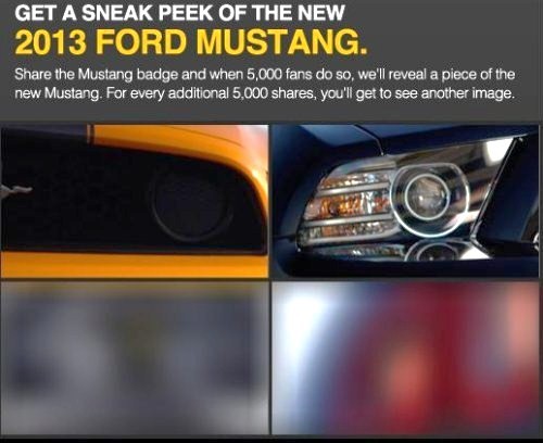 Ford has offered the graphic on the right with four pictures of the 2013 Ford Mustang blurred to the point that it’s hard to tell what you are really looking at but each time 5,000 people share the Mustang badge, FoMoCo will unveil one of the images. As you can tell from the image shown here, you can see that two of the four images have become clear so we have our first official look at the grille and headlight of the 2013 Mustang thanks to the Facebook badge being “shared” over 10,000 times. Once the share meter (click here for a look at the meter) reaches 15,000, the next image will be unveiled and 20,000 shares will bring all four of the pictures into focus.