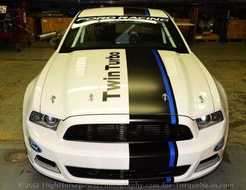 You read that right – the 2013 Ford Mustang Cobra Jet shown on the right packs the familiar 5.0L V8 that is found in the Mustang GT, the Mustang Boss 302 and the Mustang Cobra Jet but unlike those naturally aspirated powerplants…this new 5.0L packs a pair of Borg Warner turbochargers that help this to be one of the fastest Cobra Jet Mustangs ever. While the majority of the specifications of the Twin Turbo Cobra Jet Mustang are still unknown, Ford Racing representatives told us that in initial testing, this new twin turbo Mustang has turned out quarter mile times in the high 8 second range. Numbers like that would allow the Ford Racing Mustang Cobra Jet with the new turbo setup to be among the absolute quickest factory drag packages among the Detroit Big 3.