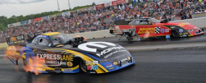The first round of qualifying for the New England Nationals was a great one, with 8 of the 15 funny cars running 3.99 or quicker. Don Schumacher drivers Jack Beckman and Tommy Johnson Jr were among those 8 with their Dodge Charger funny cars, but JFR Camaro drivers Courtney Force and Robert Hight set the pace with times of 3.842 and 3.849.