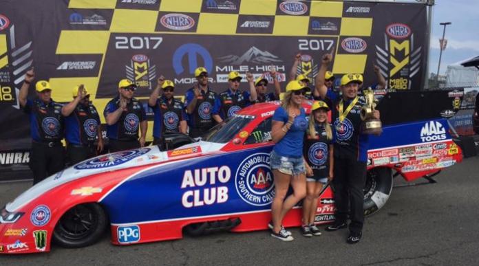 Coming into the Mopar Mile High Nationals at Bandimere Speedway in Colorado, a Don Schumacher Dodge Charger funny car had won ten straight races and 12 of the first 13 races of the 2017 NHRA season. Schumacher’s quarter of drivers have left no question which team is the dominant force in the funny car class, but Hagan, Capps, Beckman and Johnson watched their win streak end at the event sponsored by the brand which powers them.