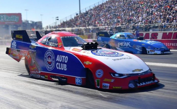 In the first round in Vegas, John Force beat Ron Capps convincingly and he then lost to Robert Hight in the second round. Hight would lose in the semifinals to Courtney Force, but by advancing to the semis while Capps lost in the first round, the JFR Camaro driver moved into the top spot in the 2017 Funny Car Championship run.