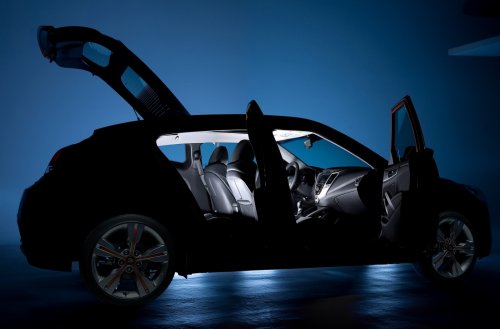 Over the past few months, we have been privy to plenty of spy footage showing the 2011 Hyundai Veloster in heavy “mule camo”, leading to much speculation over what we could expect in the way of doors and seating. The Hyundai teaser site (click here for more on that) offers a shadowy image from the front, showing a very low, sporty profile but it doesn’t tell us much else. This image puts all of that speculation to rest as we see that the Veloster has 4 full-sized doors and a rear hatch design that could create a massive cargo area. This image also shows off a set of sporty split-spoke wheels that really fill out the wheel openings and the hard angles inside continue that sporty feel.