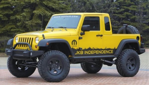 (Note: The image above shows the Mopar JK8 Independence SEMA show vehicle – not a production Wrangler pickup. The actual Jeep pickup discussed here might not look anything like the truck shown here.)