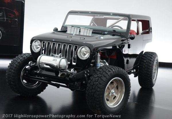 The wheelbase of this customized Jeep is longer than a standard production 2-door Wrangler and the track is wider in the front and rear, providing plenty of space for the custom wheels wrapped in big, beefy off-road tires – the first ever on a Jeep concept with staggered sizes in the front and rear. The body is shortened in the front and rear while both the windshield and hardtop have been chopped to give this Jeep an old school hot rod feel. The team also crafted the unique flip-forward hood with a big opening in the center for the Hillborn-style injection to show itself to the world.