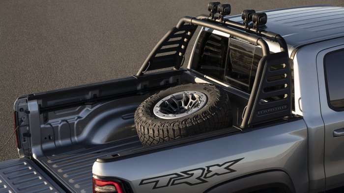 Next, the bed-mounted spare tire carrier (82216108AA) shown in the pictures here really bolsters the off-road race truck look with a price of $995. According to the press release, this tire carrier can easily be removed to get full use of the bed.