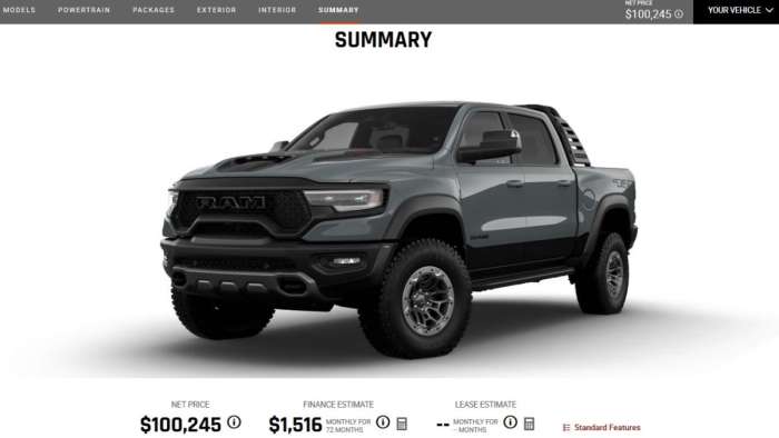 Fortunately, the Build & Price tool on the Ram Trucks website is live with a full list of options and pricing. Unfortunately, the configurator doesn’t seem to be working quite right, so building your ideal Hellcat-powered pickup isn’t as simple as most models, but the numbers are all there. For those who don’t want to navigate the system, we have gathered all of the option prices for you and you can find them all below.