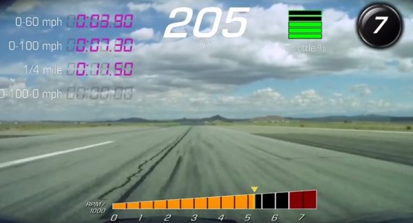 After the driver of the Corvette Z06 waits for a minute while the previous car races off into the distance, the Callaway SC757 car prepares for the run (around 58 seconds into the video). The Callaway Corvette hits 60mph in 3.9 seconds, 100mph in 7.3 seconds and it reaches the end of the ¼ mile in 11.5 seconds. More importantly, the 757 horsepower supercharged Corvette reaches an official speed of 202.3 miles per hour per the track timing system, but from the on-board system, this Corvette hits a whopping 205 miles per hour.