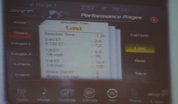 Also, the Charger shown launching was fitted with full race slicks and not drag radials – but that doesn’t change the fact that the Performance Pages screen showing a 2.9 second 0-60 and the 10.7 quarter mile does not pertain to this Charger drag strip pass.