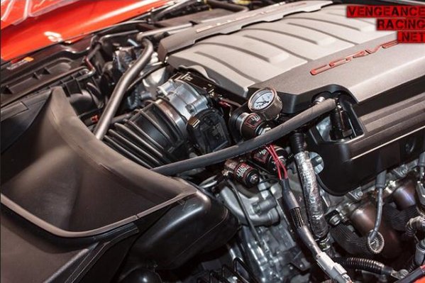 Vengeance first added their own custom camshaft package to their 2014 Chevrolet Corvette Stingray with new valve springs, pushrods, lifters and the rest of the items needed for a proper high performance camshaft swap followed by a Katech timing chain. Next up for this red C7 was a set of American Racing long tube headers and a catted 3” X pipe to help the beast breathe and as a result, Vengeance was able to pull 511 .74 horsepower and 446.21lb-ft of torque from the new LT1 V8. Those are great numbers considering how little was done to the car but when the crew started introducing nitrous oxide to the setup – the numbers went up by incredible levels.