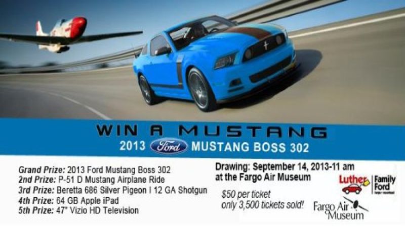 Again, the raffle to pick the winner of the 2013 Ford Mustang Boss 302 is scheduled to be held on Saturday, September 14th at 11AM which is just over a week away so if you want your chance to win the Boss Mustang, a ride in the P-51 Mustang, a shotgun, an iPad or an HD TV, contact the Fargo Air Museum right away! The website has a cool walk around video of the Boss followed by some clips of the P-51 Mustang in action right alongside of the Boss 302.