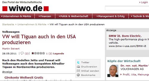 Production is likely to be at VW’s new $1 billion assembly plant in Chattanooga, Tennessee, although it’s older plant in Puebla, Mexico is also a possibility. The move is seen as a way to reduce costs by protecting against a fluctuating exchange rate. Along with final assembly many parts and materials would be from US suppliers. Volkswagen has set a goal to surpass Toyota in worldwide auto sales, and lowering prices is part of its long-term strategy.