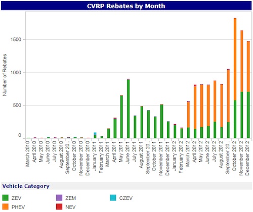 California's Clean Vehicle Rebate Project (CVRP) is an additional purchase incentives for zero emission (all electric or fuel cell) vehicles, plug-in hybrid vehicles, and zero emission motorcycles. The project recently released data for uptake of these vehicles between March 2010 and December 2012. The data shows that over half of qualifying clean vehicle purchases were for all electric vehicles.