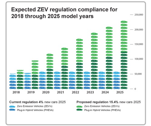 Starting in 2018 there are requirements of increased zero emission vehicle sales with a 2025 goal that 15.4% of new car sales will be ZEV's and plug-in hybrids. This move is meant to increase sales and bring down the incremental cost of these vehicles.