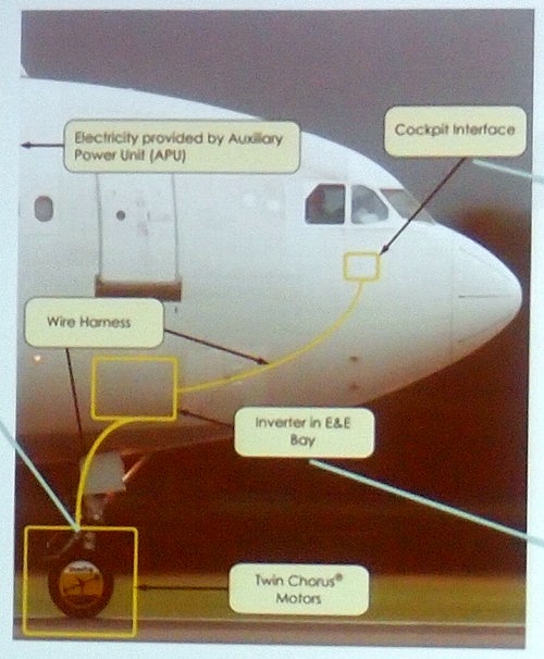 A most interesting gizmo has been developed by WheelTug for use with jumbo jetliners. The problem targeted by WheelTug is the time jet airplanes sit on the ground with engines running. This is wasted fuel that wastes fuel and creates excess pollution. The wasted fuel is a cost the airline companies want to avoid, and the company believes their technology can improve efficiency of airport operations near terminals. The WheelTug is a large electric wheel motor that fits onto the nose landing gear of an jet airplane, replacing the normal wheel used on these aircraft, and is powered by on-board power units. That wheel motor is sufficient to move the airplane around the ground without requiring an external tug, or requiring the pilot to use the jet engines for this purpose. Jet engines turn out to be an extremely inefficient way for taxing aircraft, and the electric WheelTug does the job more efficiently. It also allows ground crews to completely do away with ground based tugs to push back aircraft, this avoids the risk of the ground tug damaging aircraft. It also speeds up ground operations because the aircraft can now roll itself back and then just get going, rather than having to wait for the ground tug operator to disconnect the aircraft from the tug before it can roll away.