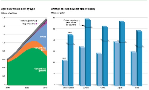 Electrified vehicles (whether hybrid, battery, super-capacitor or fuel cell) are an example of the efficiency improvements the report discusses. While the report expects the global fleet to rise to 1.6 billion vehicles "fuel" consumption (for personal vehicles) will decrease slightly by 2040. Fuel efficiency gains in "conventional" (non-electrified) vehicles will be good, but not good enough to meet changing government efficiency standards, and meeting the higher standards means electrification (hybrid or otherwise) of the vehicle fleet. Exxon is expecting the majority of these vehicles to mainly use gasoline, and have a small battery pack for an efficiency boost. Another factor will be smaller/lighter vehicles, that simply require less energy to move around. Many of the automobile manufacturers are developing concept vehicles for future transportation needs that are ultra-compact electric personal vehicles for urban use that are completely unlike anything we see on the road today.