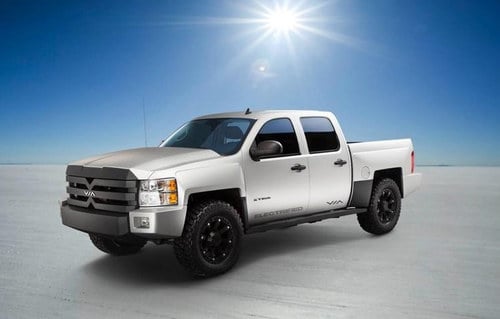 Via Motors makes a line of plug-in hybrid electric trucks aimed at commercial fleet owners. They have designed a plug-in hybrid drive train that theoretically can be installed in any truck, but the company has a supply arrangement with General Motors where Via's trucks are re-manufactured GM vehicles. For example the VTRUX is based on a Chevy Silverado 1500. See Via Motors teases electric monster truck unveiling at NAIAS next week for earlier coverage