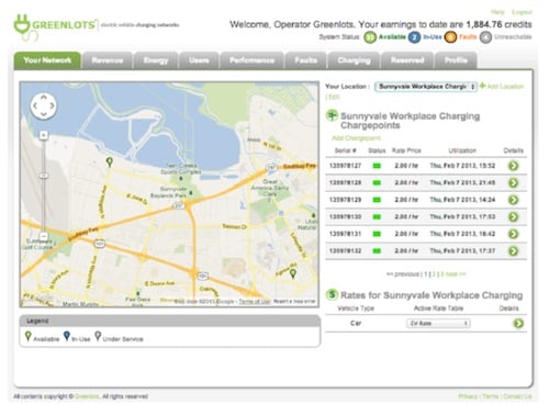 GreenLots is a service provider whose system implements the software necessary to manage a charging network.