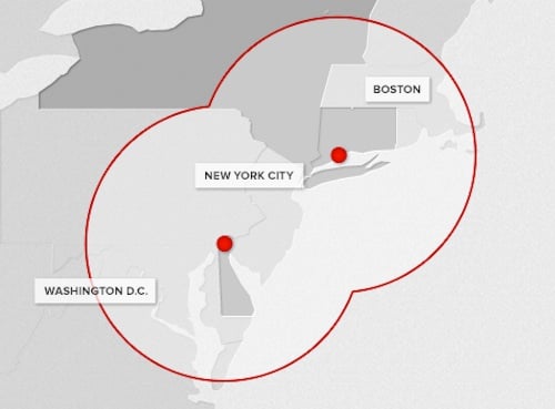 Tesla's website shows these two locations as providing a pair of bubbles that begin to cover the Washington DC to Boston corridor. The distance between these stations (199 miles) places them further apart than in California, leading one to think the company will build other Supercharger stations along this corridor and further south along I-95.