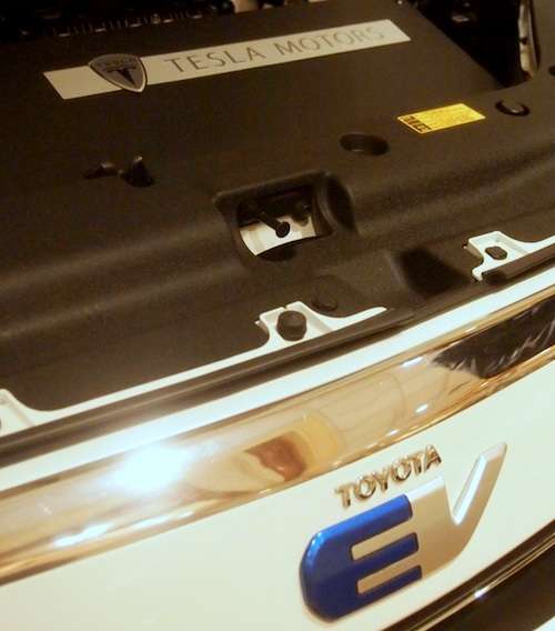 We were able to see a Toyota RAV4 EV prototype at the IdTechEx Electric Vehicles meeting last month. That car was built on a current RAV4, a model that's six years old. It is unknown whether the official RAV4 EV will be built off the existing RAV4 base, or whether it will be built on a new RAV4 base vehicle. The prototype vehicle had Tesla Motors markings on all the components under the hood, but was festooned with Toyota branding on the outside. No space in the passenger or luggage compartment were consumed by the electric drive train, presumably the battery pack is located underneath the passenger cabin just as it is in the Tesla Model S. The charging port, located under flap on the drivers side rear, used the Tesla-proprietary charging socket rather than the industry standard J1772.