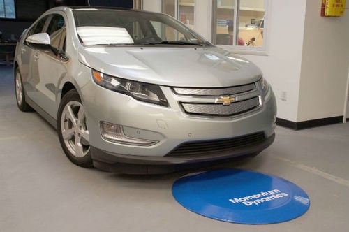 What if an electric truck, like airport shuttle buses, could run 24/7 by charging a bit every time they stop? According to Momentum Dynamics, developer of a wireless electric car charging system, the company's charging system could mean an all electric airport shuttle bus that can run 24 hours a day, without requiring a long recharging stop, instead staying on the road the whole day picking up and dropping off passengers. To demonstrate the system, the company has outfitted a Chevy Volt with their wireless charging system, to demonstrate wireless charging in operation at this weeks Commercial Vehicle Megatrends USA 2012 conference in Dearborn, MI.