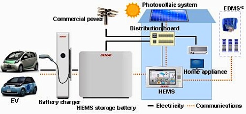 DENSO' s HEMS System. DENSO' s home energy management system, HEMS builds on top of Toyota’s with the ability to quickly charge an electric car with direct current from the HEMS storage battery, as well as supply electricity from the vehicle back to a house. The system becomes even more attractive if you happen to have some sort of alternative energy source, such as photovoltaic systems array (solar panels) or windmills.