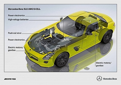 The SLS AMG E-Cell is an electric all-wheel drive EV developed after 2 years of cooperation between Mercedes-AMG and Mercedes AMG High Performance Powertrains of Brixworth, England. Sporting one electric motor per wheel, not in-hub, but via independently driven shafts, the four synchronous motors rev up to an electronically limited 12,000 rpm. The total peak output is 525 hp with a peak torque of 650 ft-lb. The peak 650 foot-pounds of torque is readily available starting at 4,000 rpm.
